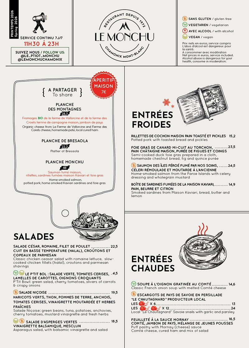 Benefiting from several different areas, over two levels, two bars and a private, covered outside seating area, Le Monchu at the foot of Mont-Blanc, in the centre of Chamonix is the ideal restaurant to welcome your groups and events. Contact our team who will be able to provide you with a quote in line with your needs and expectations.